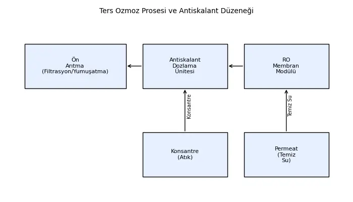 Bu akış şeması, tipik bir ters ozmoz tesisindeki ön arıtma, antiskalant dozlama, membran modülü ve temiz su/konsantre hattının nasıl organize edildiğini gösterir. Ön arıtma bölümünde filtreler ve yumuşatma birimleri yer alırken, dozaj ünitesi antiskalantı besleme suyuna enjekte eder. Membran modülünden çıkan permeat temiz su olarak kullanıma sunulur; konsantre akış ise ayrı bir hatla uzaklaştırılır.