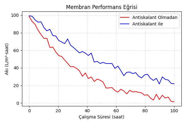 Grafikte Antiskalant ile ve Antiskalant Olmadan çalışan sistemlerin akı değerleri yer alır. Gözlemlendiği gibi antiskalant kullanılan sistemlerde membran tıkanması gecikir, akı daha yavaş düşer ve toplam üretim daha yüksek olur.